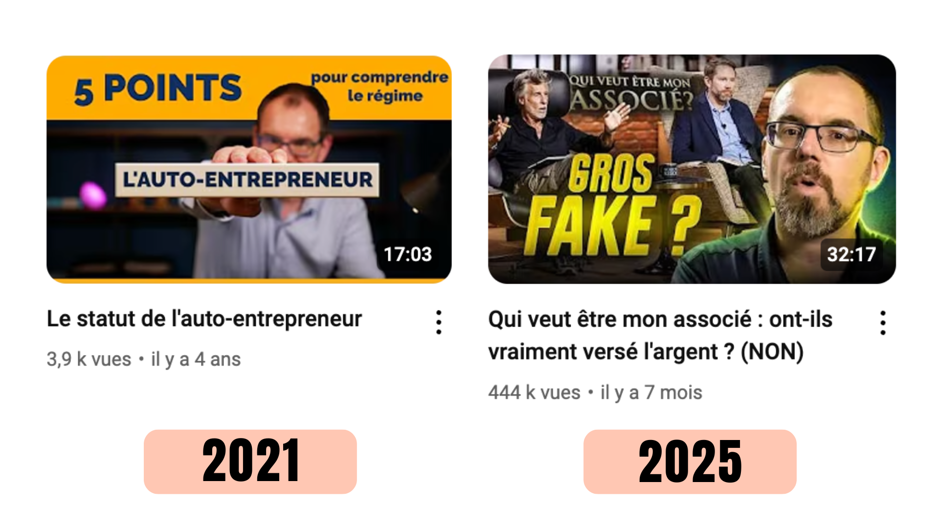 Il suffit de regarder la chaine YouTube de ce comptable, qui est aujourd'hui à plus de 100 000 abonnés. Si tu fais la comparaison de ces miniatures entre le début de sa chaine à aujourd'hui, tu vois bien qu'il s'est donné les moyens de faire grossir sa chaine. Et surtout de se faire accompagner d'experts en stratégie YouTube.
