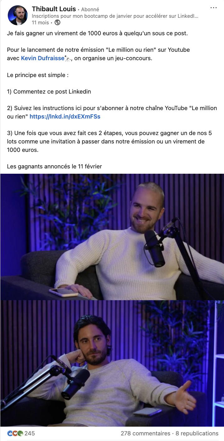 Un bon exemple est celui de Thibault Louis, qui a réussi un coup de com’ impactant pour le lancement de son podcast business sur YouTube.