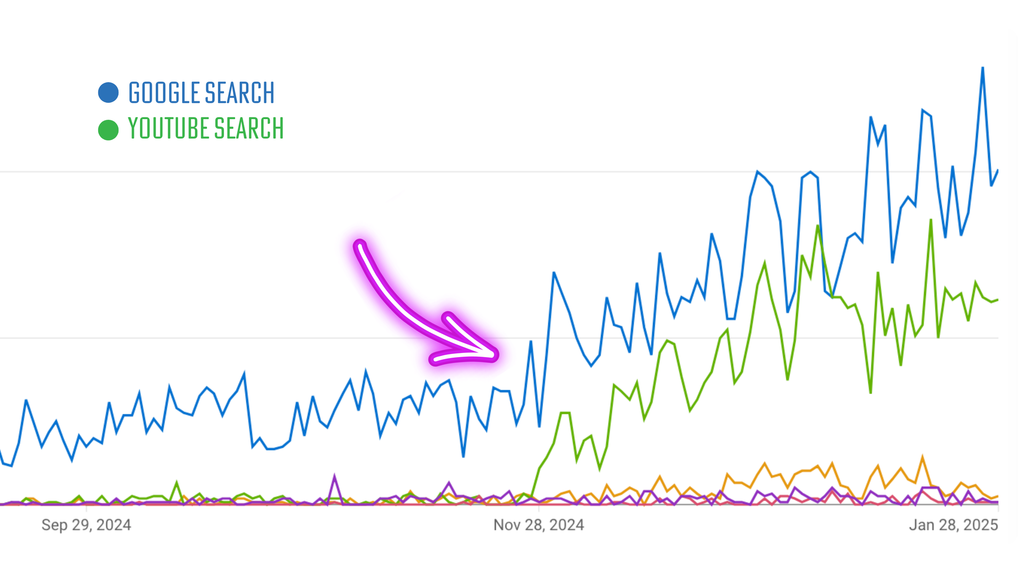 Si tu fais tous ces changements, tu verras que la source de traffic "Recherche YouTube" va augmenter de manière significative, comme dans cet exemple :
