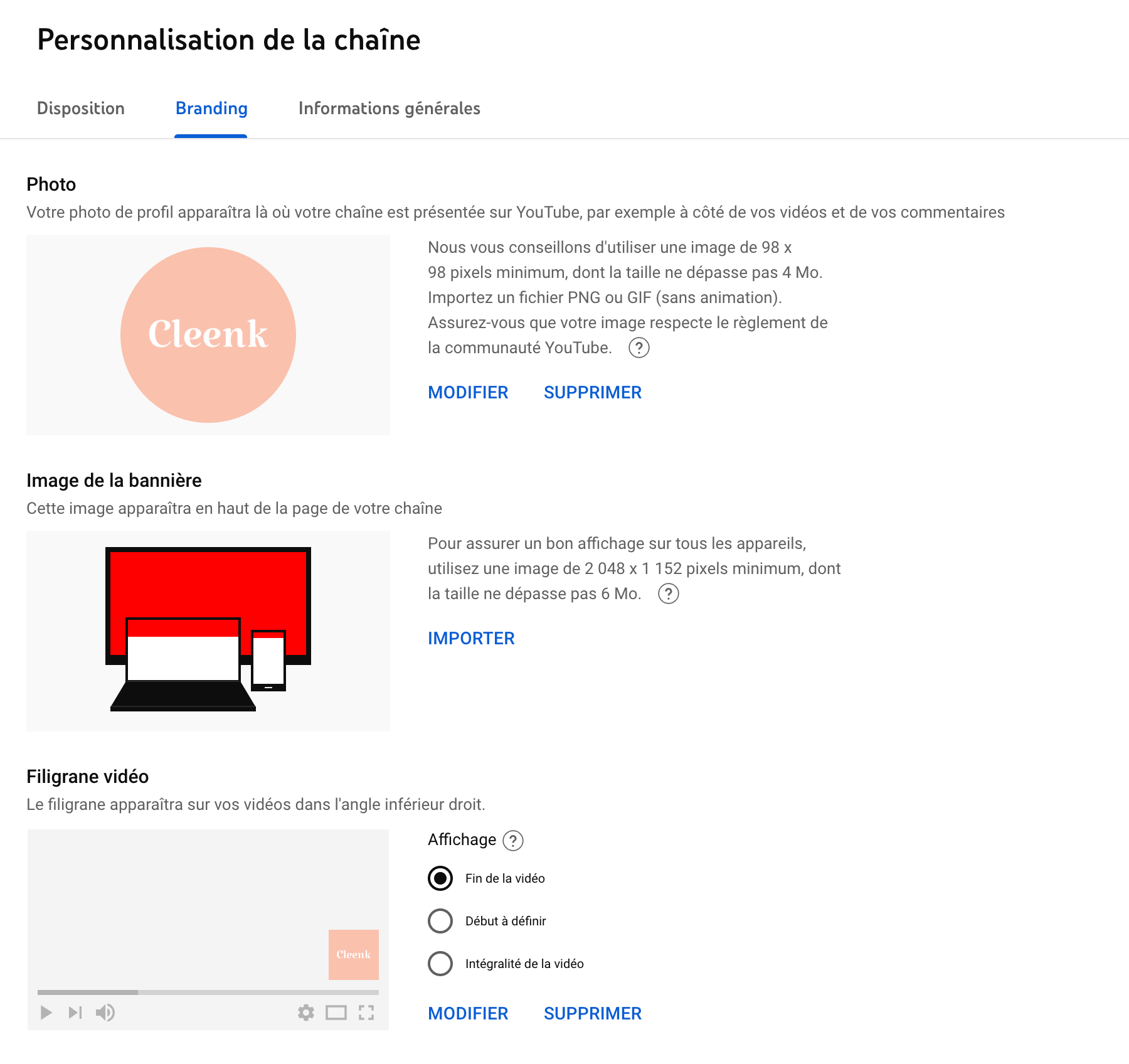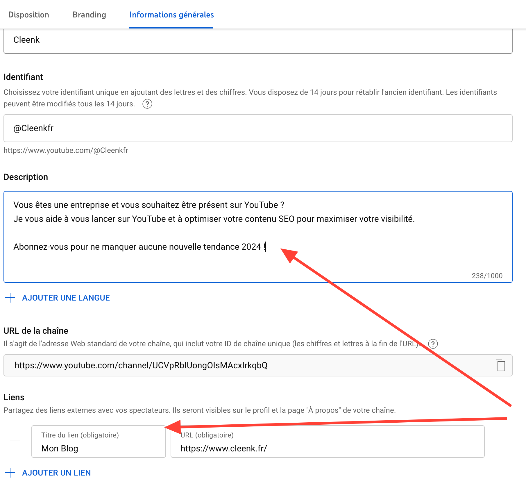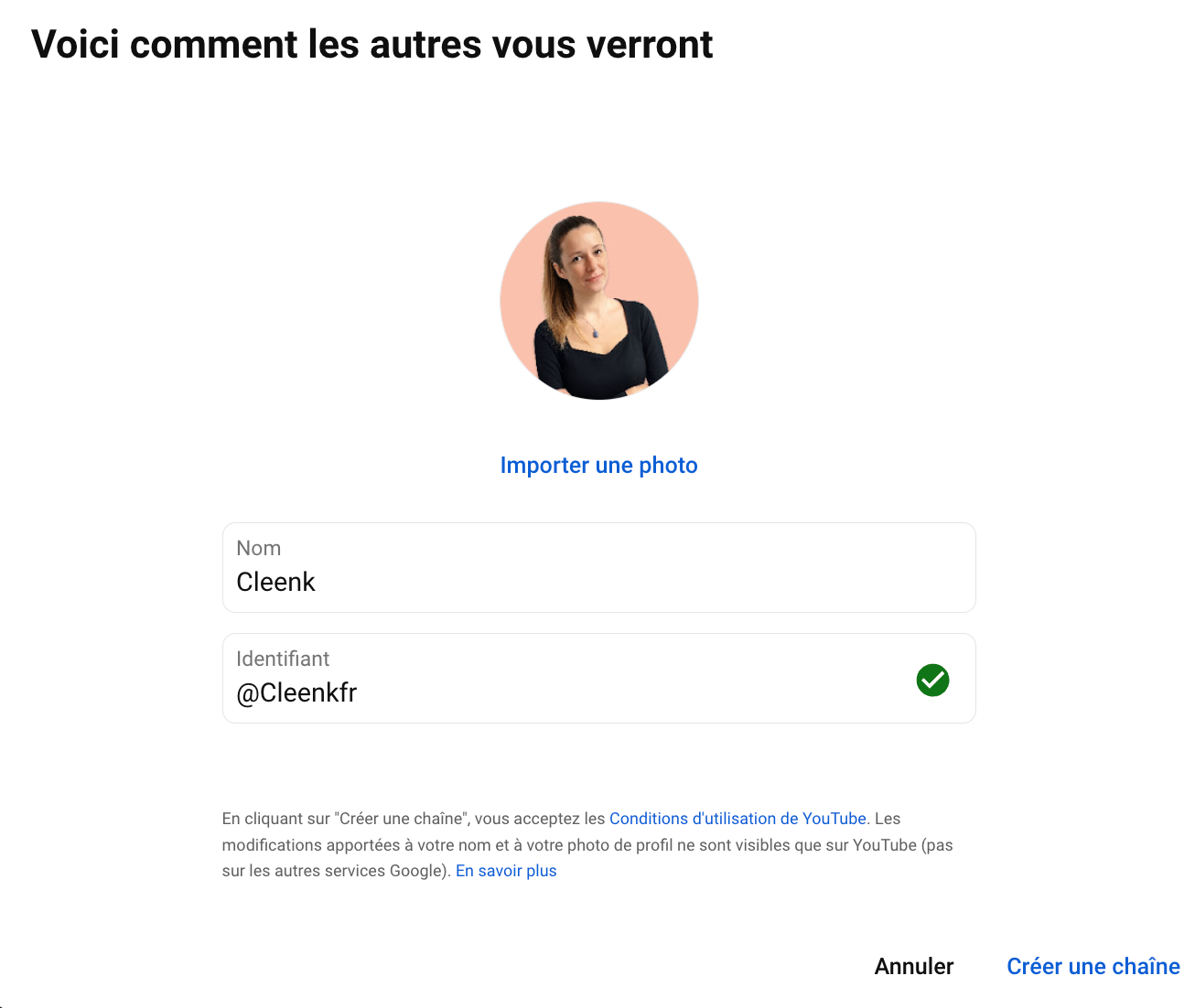 Remarque : tu peux changer le nom et identifiant de chaine seulement tous les 14 jours.