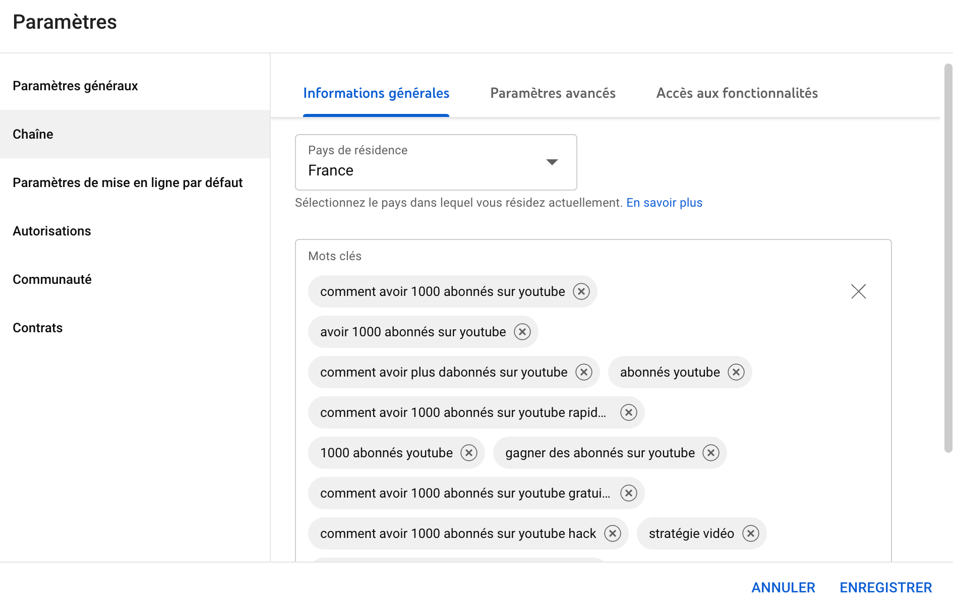 Dans informations générales, tu vas remplir la description de votre chaine, c'est un peu comme le à propos d'un site web. Ici, tu dois premièrement présenter ce que les lecteurs vont trouver sur ta chaine : Des tutos sur le bricolage ? Des formations dans la restauration ? Des recettes de cuisine ? Cette étape est essentielle pour que l'internaute comprenne rapidement quelle est la valeur ajoutée de ta chaine.