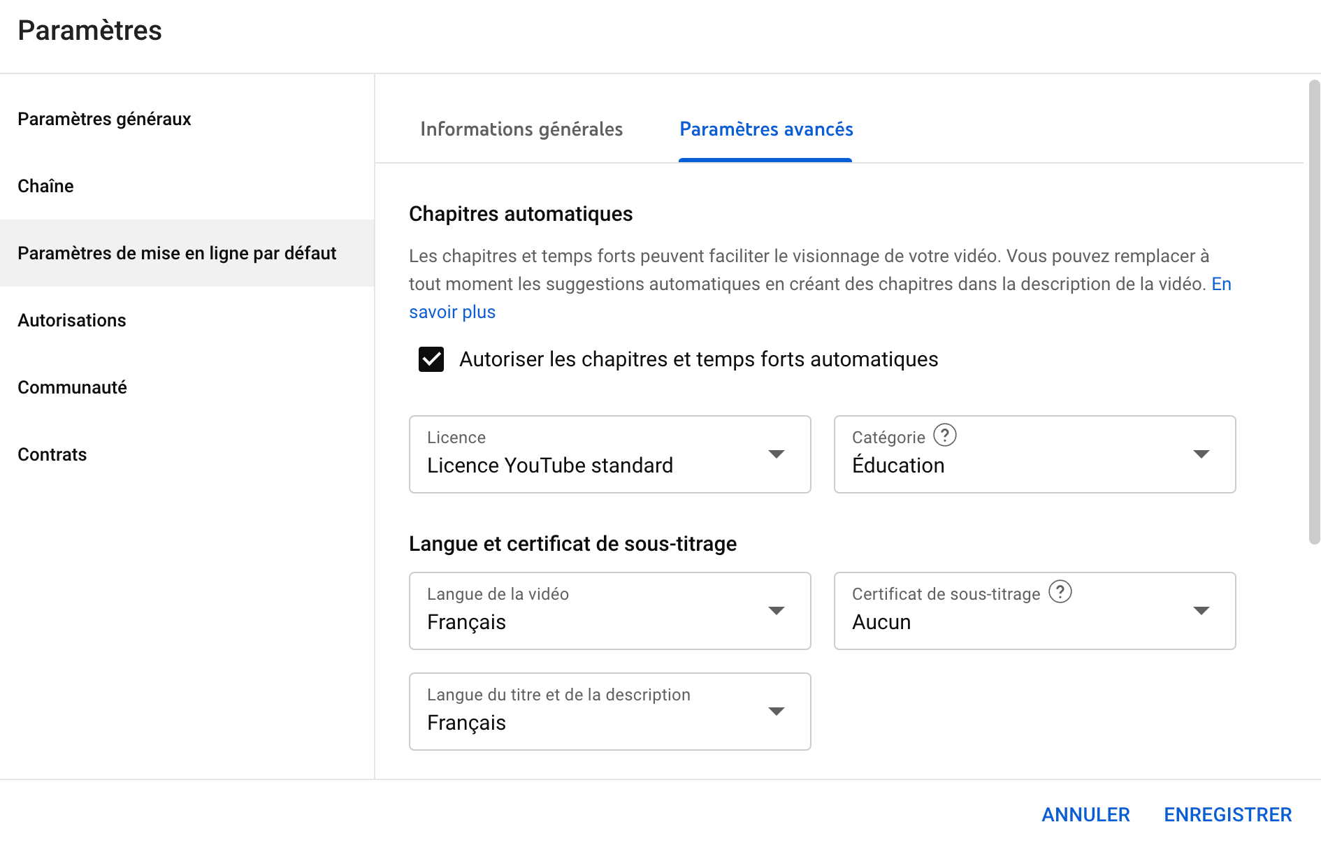 Dans paramètres avancés, veille à bien configurer la langue de vidéo en français, et fais de même pour le titre et la description.