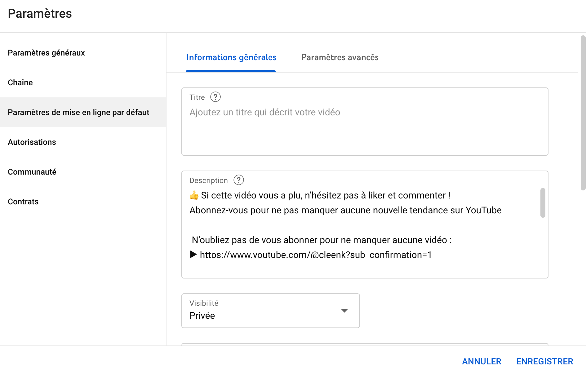 Dans paramètres de mise en ligne par défaut, on peut insérer les éléments texte ainsi que les tags que tu souhaitent faire apparaitre dans chacune de tes vidéos. Cette étape te permettra de gagner beaucoup du temps, car tu n'auras pas besoin faire ce travail pour chacune de tes vidéos si la thématique reste la même.
