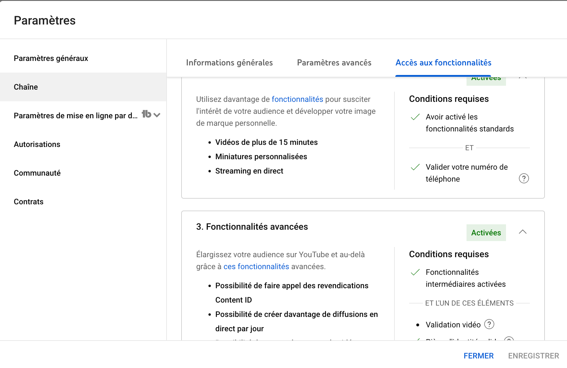 N'oublie pas de te rendre dans accès aux fonctionnalités, pour valider ton identité. On te demandera ici ta carte d'identité et ton numéro de téléphone pour avoir accès à toutes les fonctionnalités YouTube.